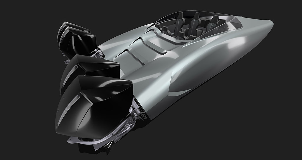 The custom boat, which weighs approximately 2,000 pounds more than its twin-engine counterpart, is available in either an eight- or six-seat cockpit configuration with center steps leading to the beefed-up transom. Beyond the wow factor of having four engines, Wagner said the main selling points of opting for the quad setup are going to be the acceleration, the extended range and the confidence of having four motors to complete any journey.